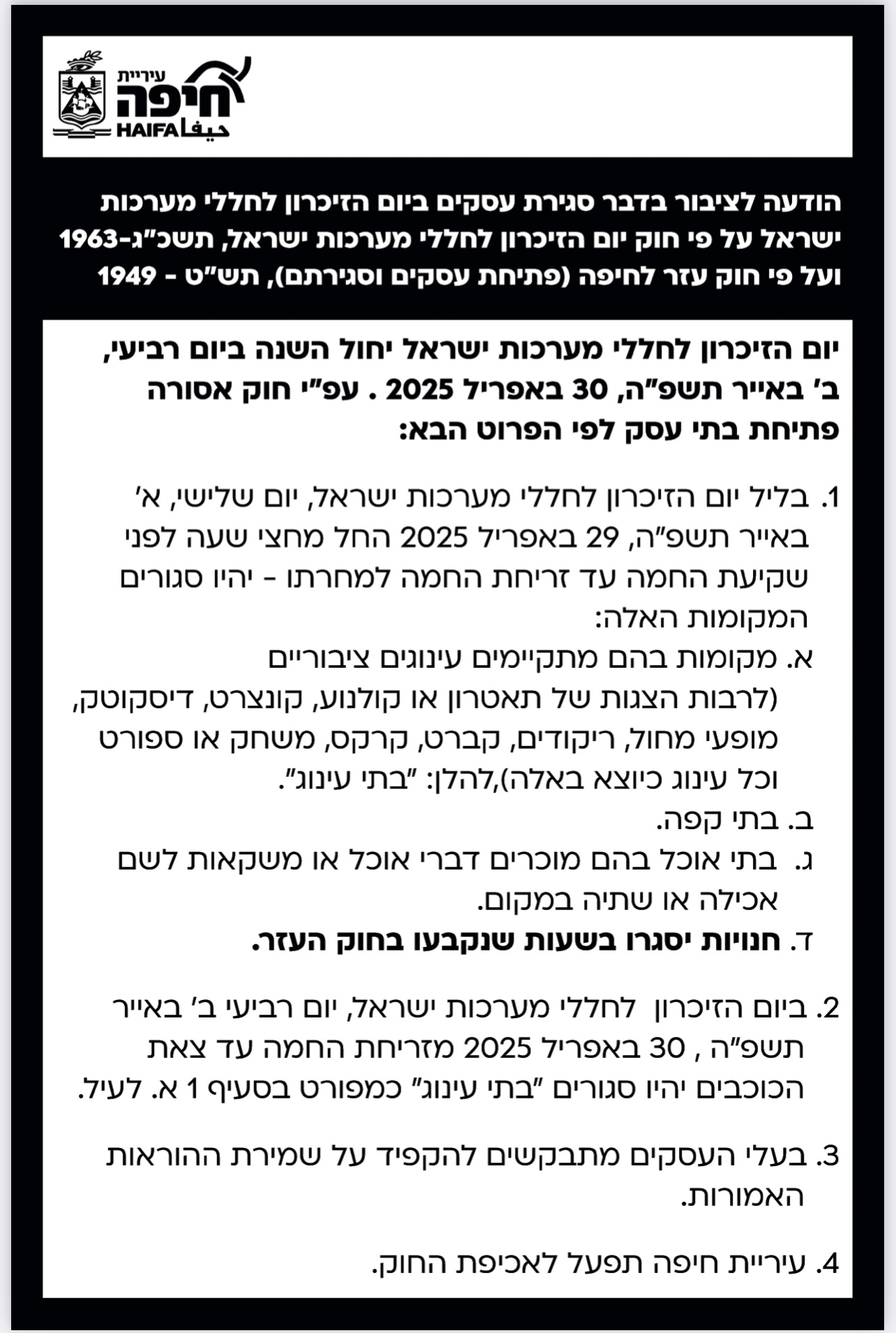 بلدية حيفا إعلان للجمهور بشأن إغلاق المصالح التجارية مساء، يوم الثلاثاء 29 أبريل 2025، بدءًا من الساعة 18:30 (نصف ساعة قبل غروب الشمس وحتى الشروق )