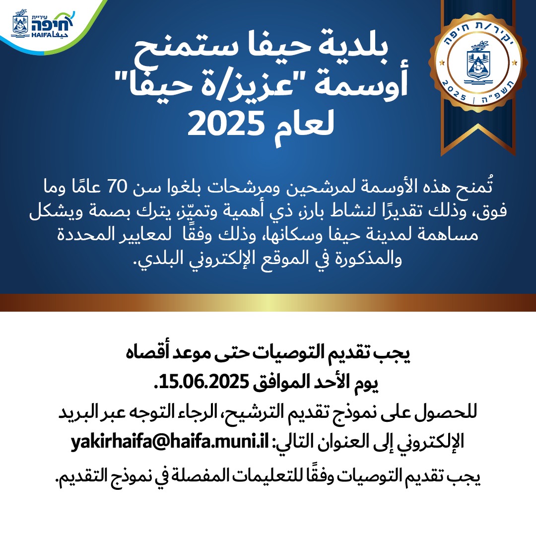 بلدية حيفا تمنح أوسمة “عزيز/ة حيفا ” لعام 2025