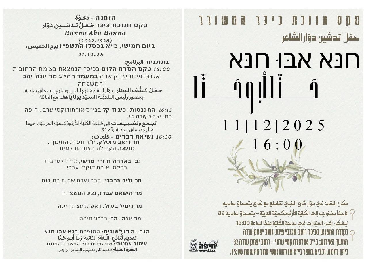 تشهد مدينة حيفا يوم الخميس 11 كانون الأول 2025 حدثًا مميزًا، حيث سيقام حفل تدشين دوّار حنّا أبو حنّا في شارع اللنبي، زاوية شارع يتسحاك سادية، وذلك بحضور العائلة، ورئيس بلدية حيفا، وعدد من الشخصيات الاجتماعية والثقافية البارزة.