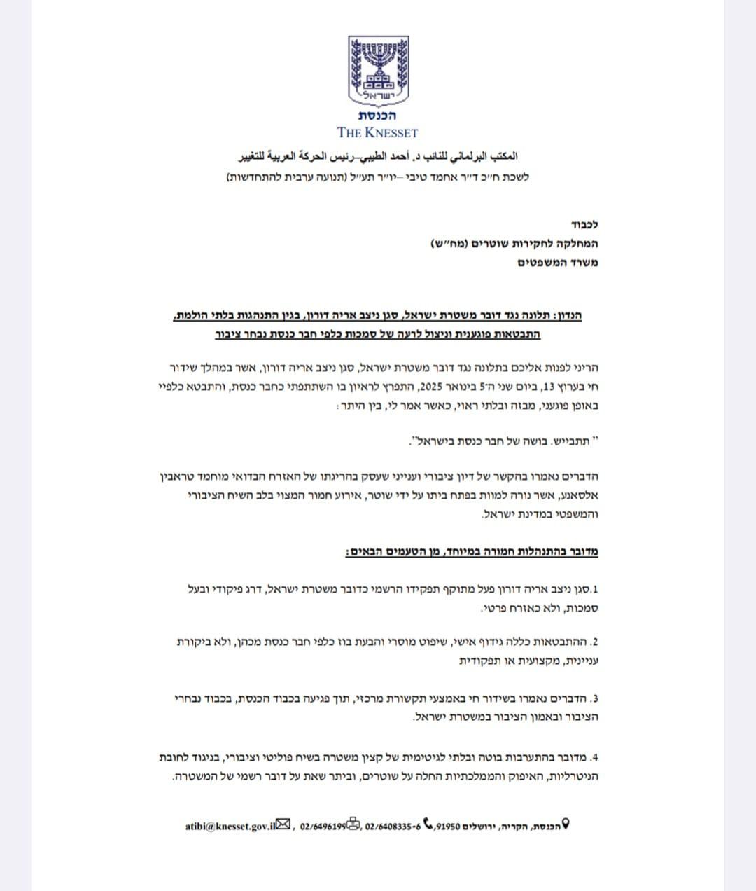 قدّم عضو الكنيست د. أحمد الطيبي، رئيس الحركة العربية للتغيير، اليوم الثلاثاء، شكوى رسمية إلى قسم التحقيق مع أفراد الشرطة في وزارة القضاء، ضد الناطق بلسان الشرطة الإسرائيلية، العقيد أريه دورون، على خلفية سلوكه خلال مقابلة تلفزيونية مع الدكتور الطيبي على القناة 13 في التلفزيون الإسرائيلي.