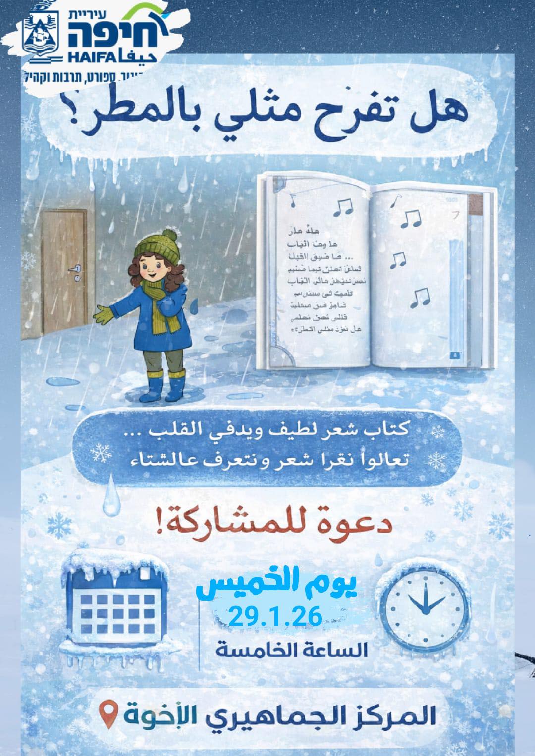 حيفا نت > حفﻻت ومناسبات > تعالوا نقرأ شعر ونتعرف على الشتاء. التسجيل عن طريق المركز 048738449تعالوا نقرأ شعر ونتعرف على الشتاء. التسجيل عن طريق المركز 048738449مراسل حيفا نت | 25/01/2026اترك تعليقاً إلغاء الردلن يتم نشر عنوان بريدك الإلكتروني. الحقول الإلزامية مشار إليها بـ *التعليق * Δ