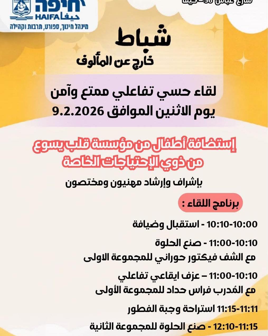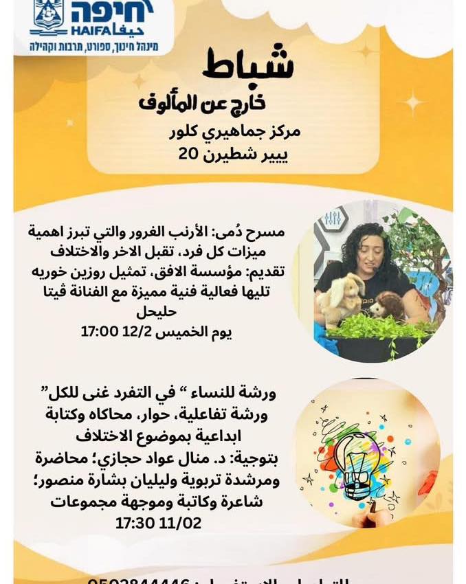 بلدية حيفا، من خلال المراكز الجماهيرية، تطلق سلسلة فعاليات مجتمعية، ثقافية وتربوية، تهدف إلى تعزيز قيم الدمج، المساواة، وقبول الآخر، وفتح المجال أمام الجميع للمشاركة، التعبير، والإبداع.