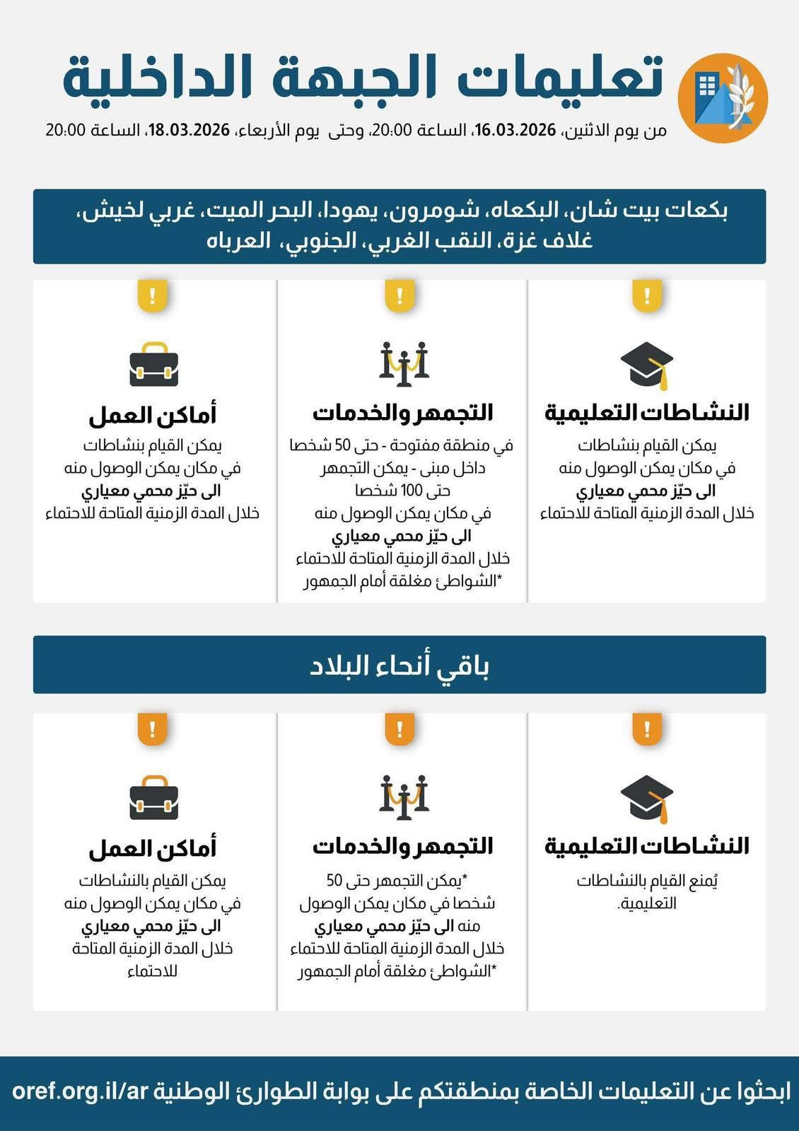 حيفا نت > الأخبار الرئيسية > تعليمات الجبهة الداخلية حتى يوم الاربعاء 18/3/2026تعليمات الجبهة الداخلية حتى يوم الاربعاء 18/3/2026مراسل حيفا نت | 17/03/2026اترك تعليقاً إلغاء الردلن يتم نشر عنوان بريدك الإلكتروني. الحقول الإلزامية مشار إليها بـ *التعليق * Δ