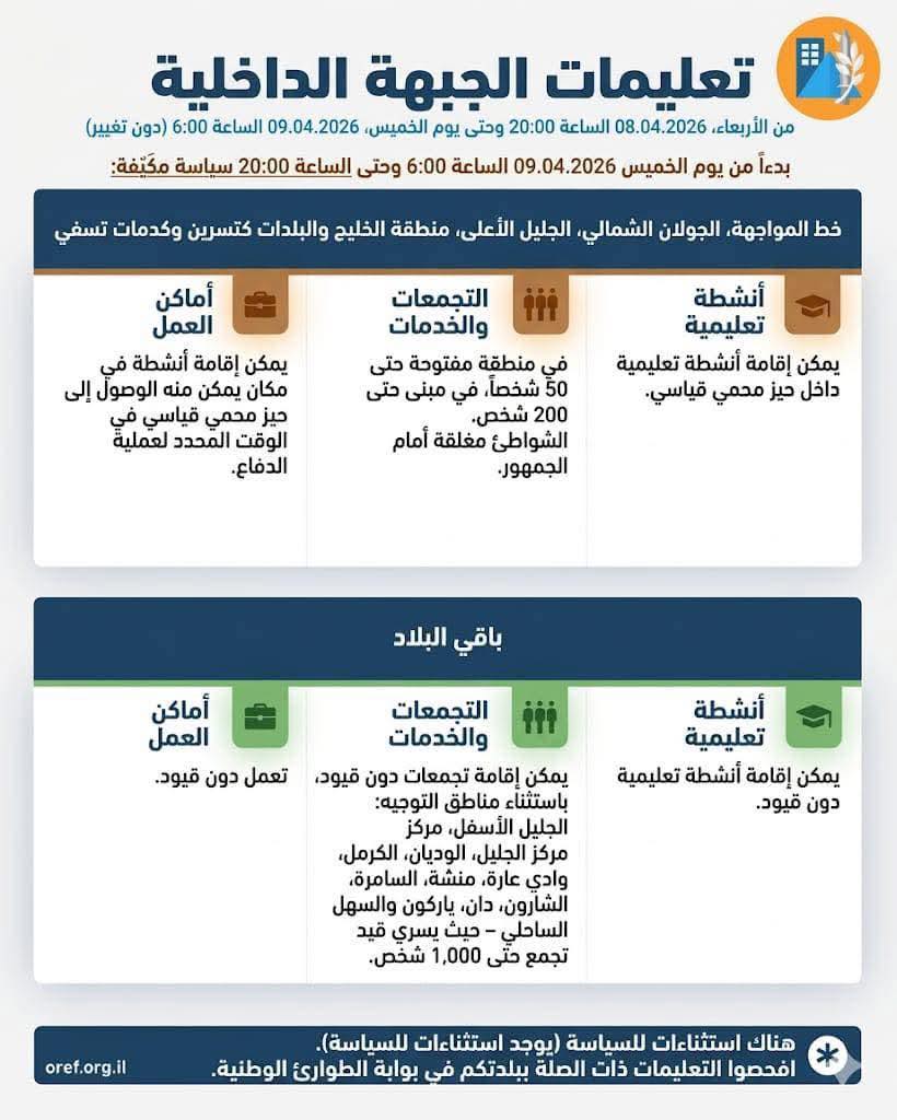 الجبهة الداخلية: تستمر التعليمات الحالية سارية المفعول حتى منيوم الخميس الساعة 20:00