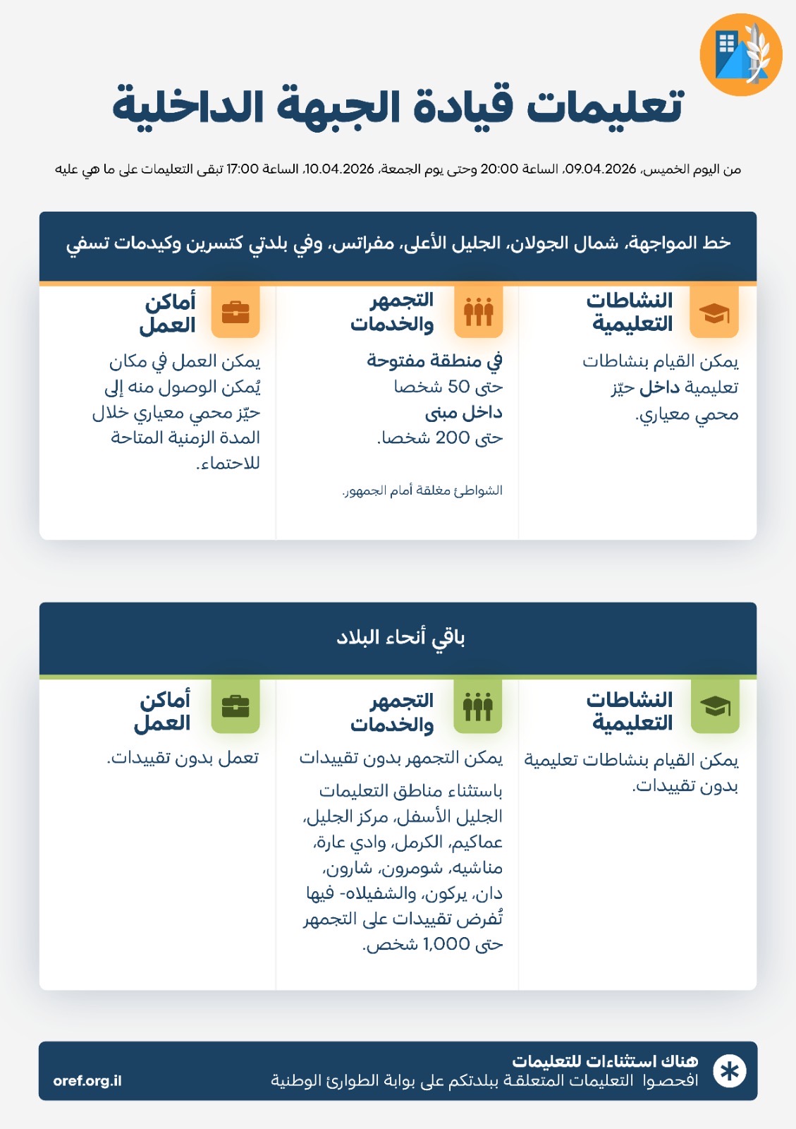 تعليمات قيادة الجبهة الداخلية حتى يوم الجمعة 10/04/2026 الساعة 17:00