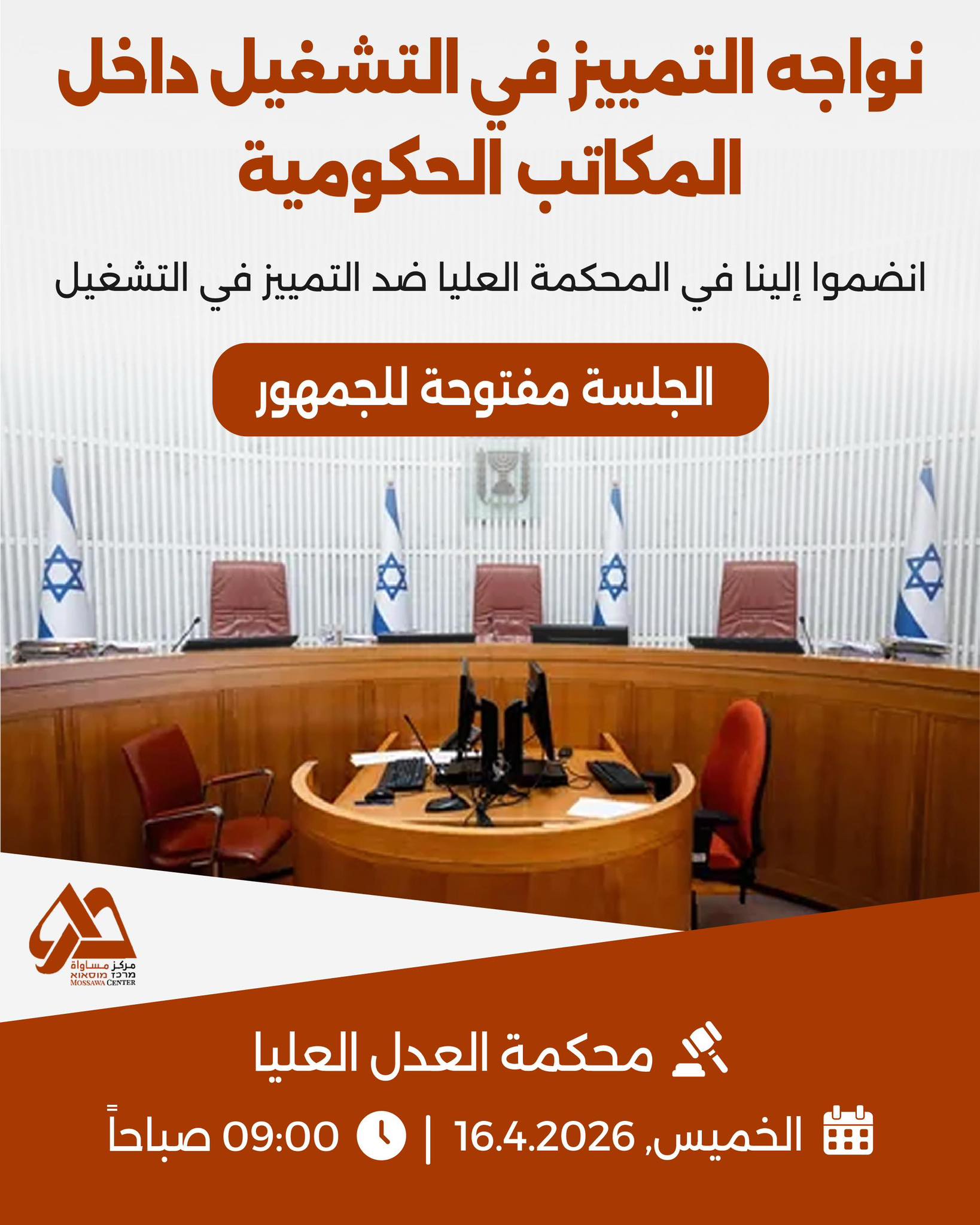 غدًا الخميس، تنظر محكمة العدل العليا في الالتماس الذي قدّمه مركز مساواة، ضد سياسات التمييز في التشغيل بحق المواطنين العرب، والتي تنتهجها مكاتب حكومية مختلفة.