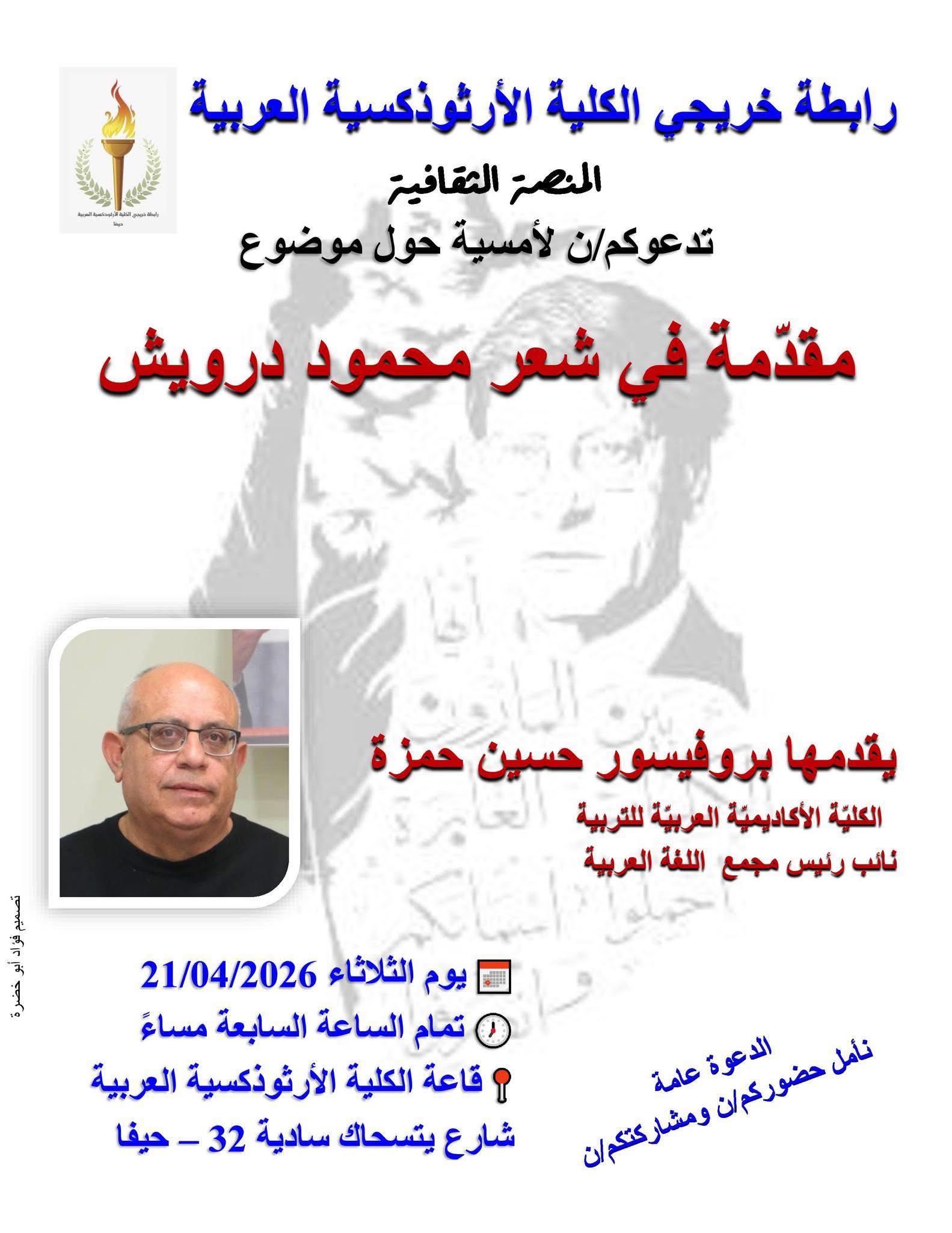 بعد انقطاعٍ طويل، يتجدّد اللقاء الثقافي في مدينة حيفا، حيث تدعو رابطة خريجي الكلية الأرثوذكسية العربية الجمهور إلى أمسية أدبية مميّزة تُقام يوم الثلاثاء الموافق 21.04.2026، في قاعة الكلية.