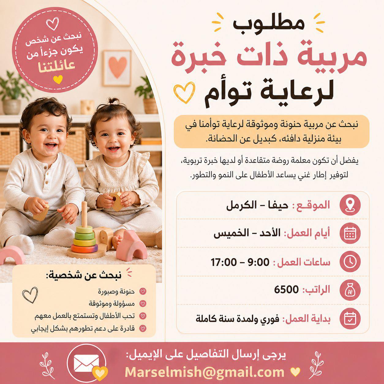 حيفا نت > أخبار حيفاوية > مطلوب مربية لتوأم في منطقة حيفامطلوب مربية لتوأم في منطقة حيفامراسل حيفا نت | 29/04/2026اترك تعليقاً إلغاء الردلن يتم نشر عنوان بريدك الإلكتروني. الحقول الإلزامية مشار إليها بـ *التعليق * Δ