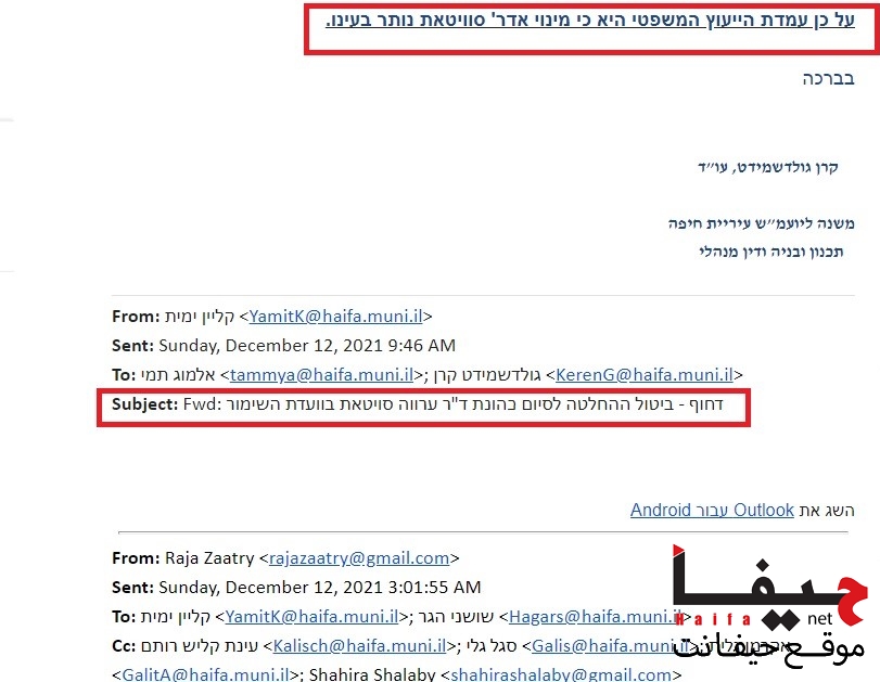 بعثت المستشارة القضائية للجنة التخطيط والبناء بلدية حيفا، المحامية كيرن جولدشميت، برسالة جوابية إلى رئيس كتلة “الجبهة” في بلدية حيفا رجا زعاترة، تفيد بأن قرار المعارضة بإقصاء مخطط المدن د. عروة سويطات من لجنة الحفاظ على المباني غير ساري المفعول، وأن الموقف القضائي هو أنه ما زال عضوًا في اللجنة، خاصةً وأن المرشح البديل البروفسور يوسي بن آرتسي أعلن أنه غير معني بعضوية اللجنة.