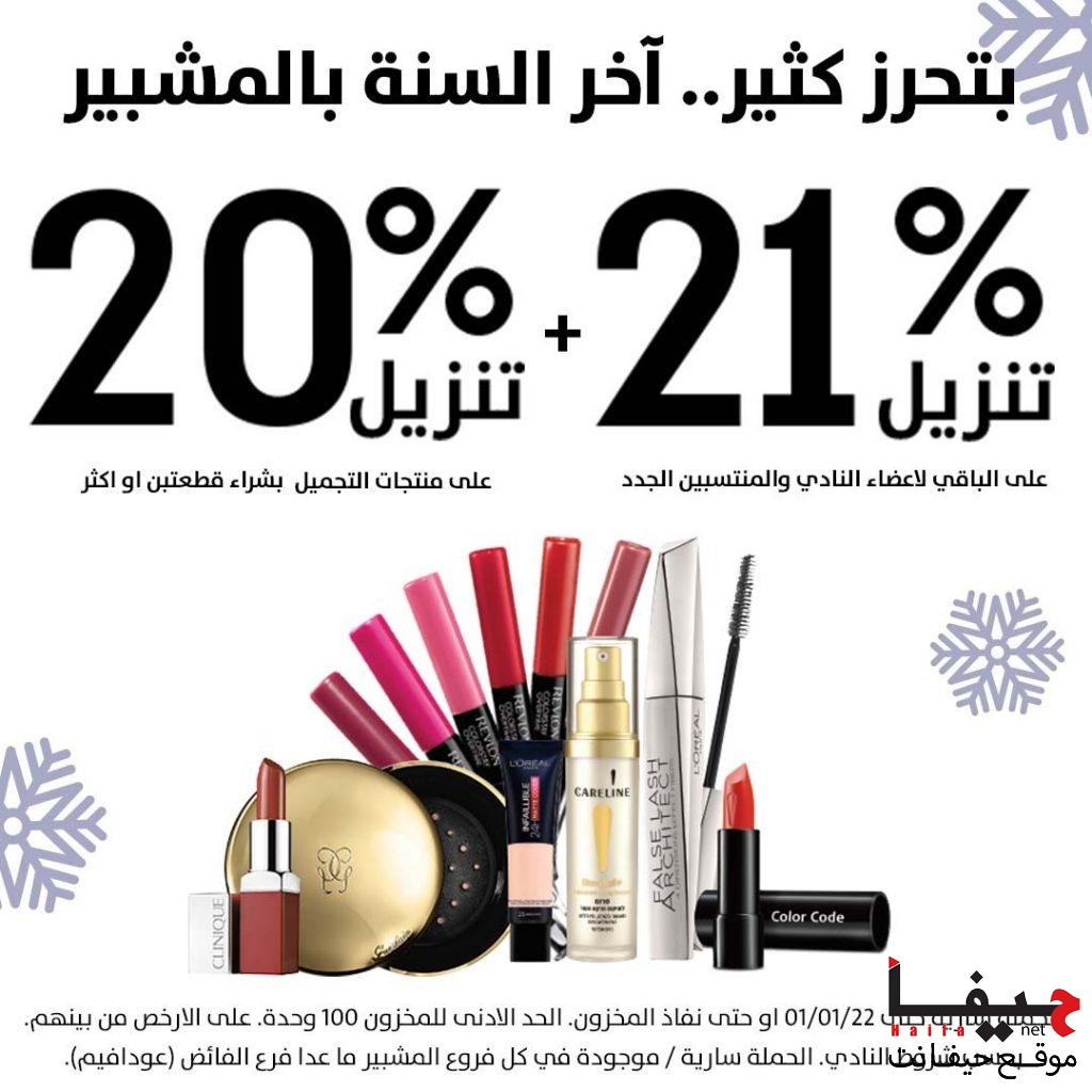 بمناسبة الاعياد ماركة المشبير تستمر بحملة أسعار اخر السنة : حتى %50 تنزيل على مجموعة منتجات مختارة عند شراء قطعتين او اكثر + %21 تنزيل على الباقي لاعضاء النادي وأيضا تنزيلات في قسم التجميل : %21 تنزيل على منتجات التجميل عند شراء قطعتين او اكثر + %20 تنزيل على الباقي لاعضاء النادي والمنتسبين الجدد.