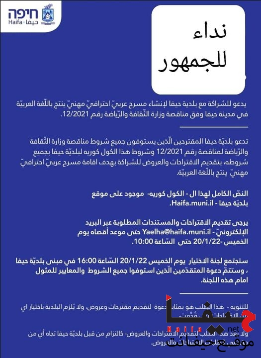 تدعو بلديّة حيفا الفنّانين في عالم المسرح من الجمهور العربي إلى التعاون مع بلديّة حيفا للتقدّم معا لمناقصة وزارة الثقافة والرّياضة لإنشاء مسرح عربيّ احترافيّ ينتج باللغة العربيّة.