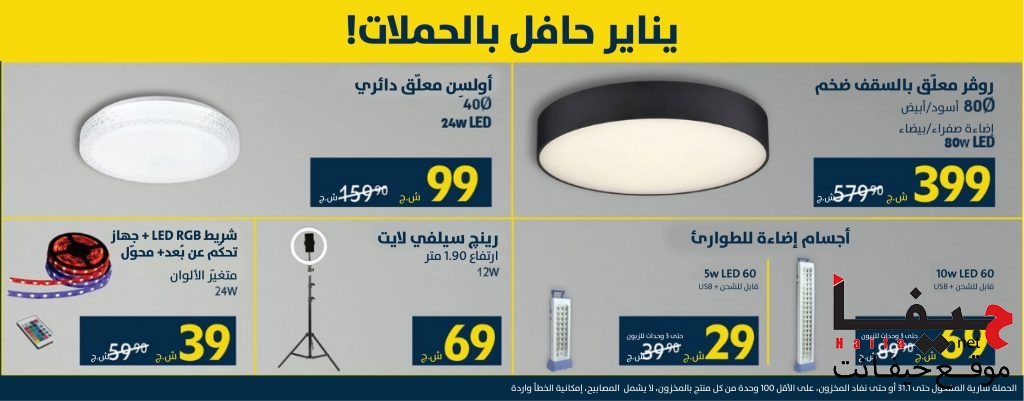 شبكة محساني تيئورا الرائدة مستمرّة في عرض أفضل المنتجات وبأسعار مريحة. صمّموا منزلكم واختاروا أجسام الإضاءة الفاخرة، أضيفوا الحميمية إلى بيتكم عن طريق النور الذي ينشر إحساسًا بالدفء خلال فترة الشتاء الباردة هذه. شهر يناير حافل بالحملات في محساني تيئورا حيث يعرض عليكم مجموعة متنوعة من المنتجات: روفر ضخم لاصق بالسقف، مصباح أوسلن دائري لاصق بالسقف بتصميم نظيف وحديث، رينج سيلفي لايت بارتفاع 1.90 متر بلون أسود فاخر، أجسام إضاءة للطوارئ عملية جدا، وشريط RGB LED بجهاز تحكّم عن بعد ومحوّل، كل هذا بتخفيض خاص وفقط لهذا الشهر.