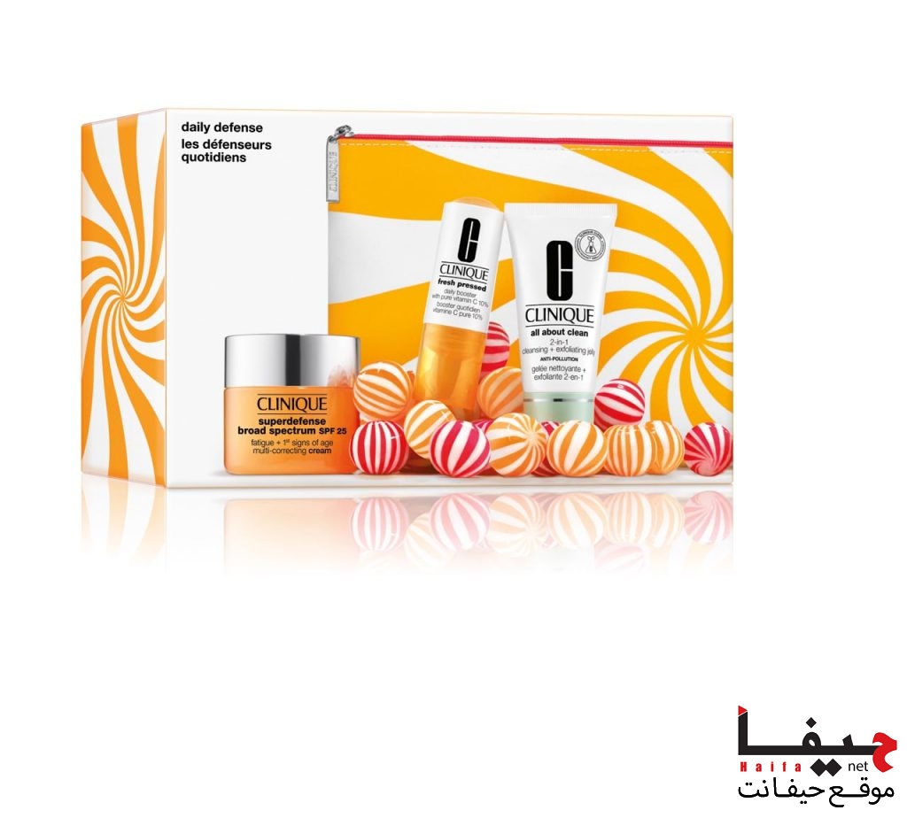 Daily Defense Set- طقم للاستخدام اليومي للحفاظ على بشرة براقة. يشمل الطقم؛ مرطب للوجه Superdefense SPF 25 بحجم 50 مل، بوستر Fresh-Pressed بحجم 8 مل، صابون للوجه مع بيلينغ All About Clean بحجم 30 مل، السعر- 188 ش.ج بدلاً من 269 ش.ج.
