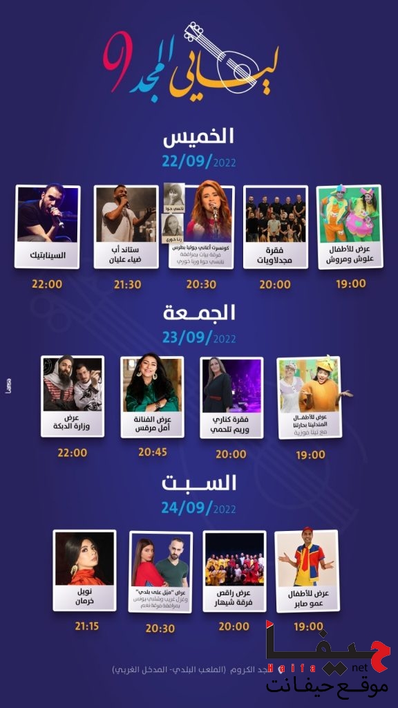 وأضافوا: ” ستشهد بلدنا ومنطقة الشاغور حدثا فنيّاضخمًا ومتنوعًا بمشاركة نجوم الفن في البلاد والعالم العربي وأبرزهم: أمل مرقس، ريم تلحمي وفرقة كناري، نويل خرمان،السينابتيك، غزل غريب وشلبي يونس وفرقة نغم، وزارة الدبكة (ولاء سبيت وبرونو كروز)، عرض “جوليا” بمشاركة رنا خوري ونانسي حوا وفرقة بيات، ستاند أب لنجم السوشيال ضياء عليان، فقرة مجدلاويات، عروض الأطفال “علوش ومروش” “تيتافوزية” و“عمو صابر”، فرقة الرقص “شيهار“ بالإضافة إلى بازار مبيعات لأعمال فنية والمأكولات المتنوعة ومفاجآت عديدة.