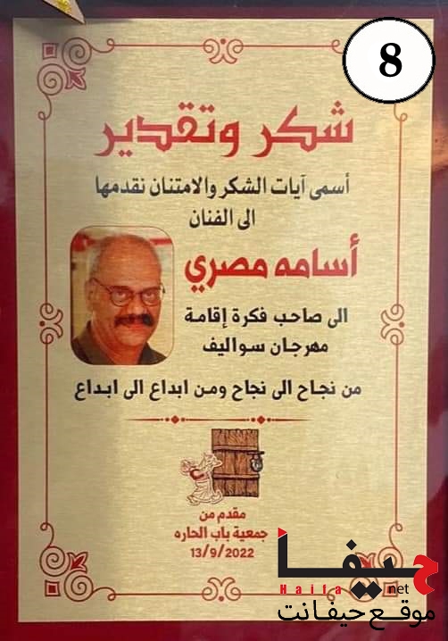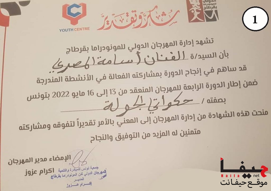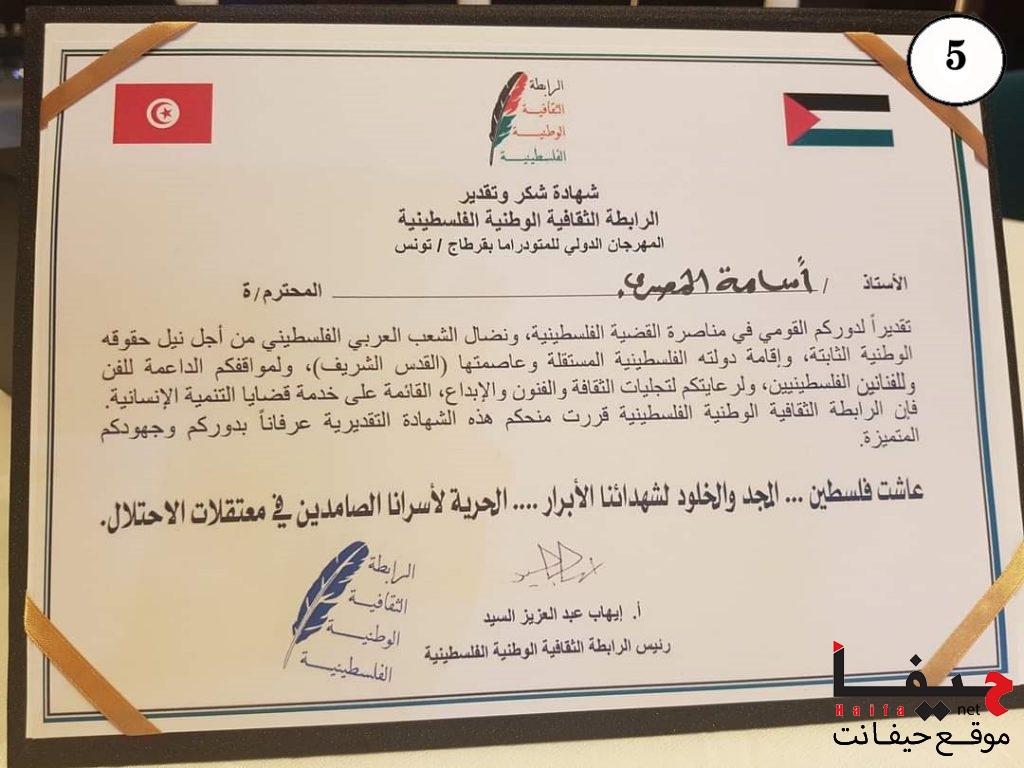 - شهادة تكريم من جمعية “باب الحارة” في مدينة طمرة، لصاحب فكرة مهرجان “سواليف” للقصاصين العرب، بمناسبة دورته الـ 12.