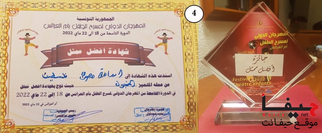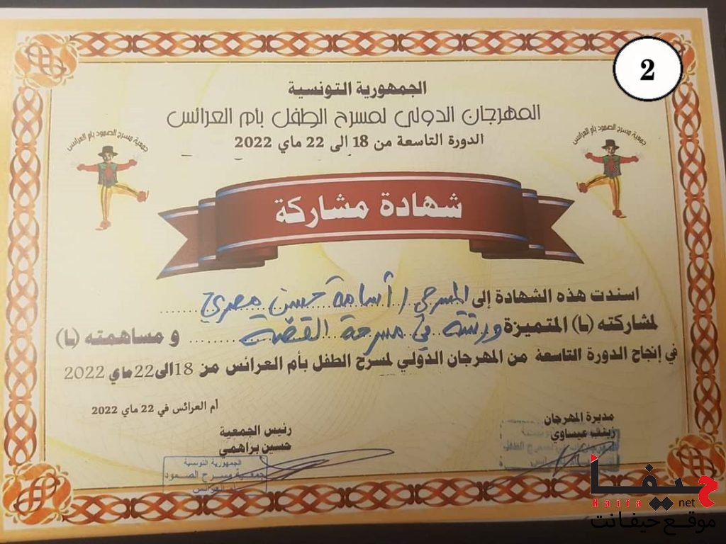 - شهادة تكريم من المهرجان الدولي لمسرح الطفل في أم العرائس/تونس، للمشاركة المتميّزة ضمن المسابقة الرسمية للمهرجان.