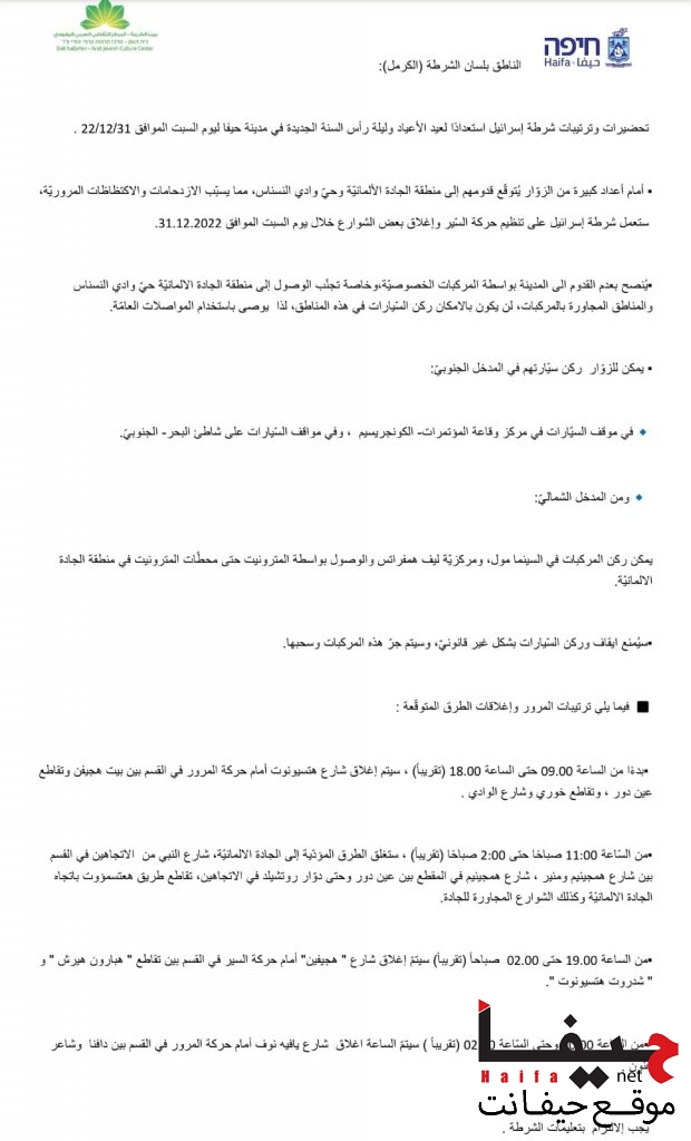 *تحضيرات وترتيبات شرطة إسرائيل استعدادًا لعيد الأعياد وليلة رأس السنة الجديدة في مدينة حيفا ليوم السبت الموافق 31/12/22* .