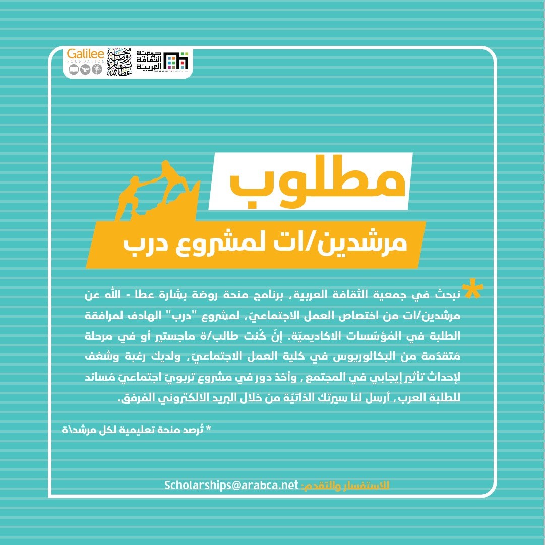مطلوب مرشدات ومرشدين لمشروع دربنبحث في جمعية الثقافة العربية، برنامج منحة روضة بشارة عطا – الله عن مرشدين/ات من اختصاص العمل الاجتماعيّ، لمشروع “درب” الهادف لمرافقة الطلبة في المُؤسّسات الاكاديميّة